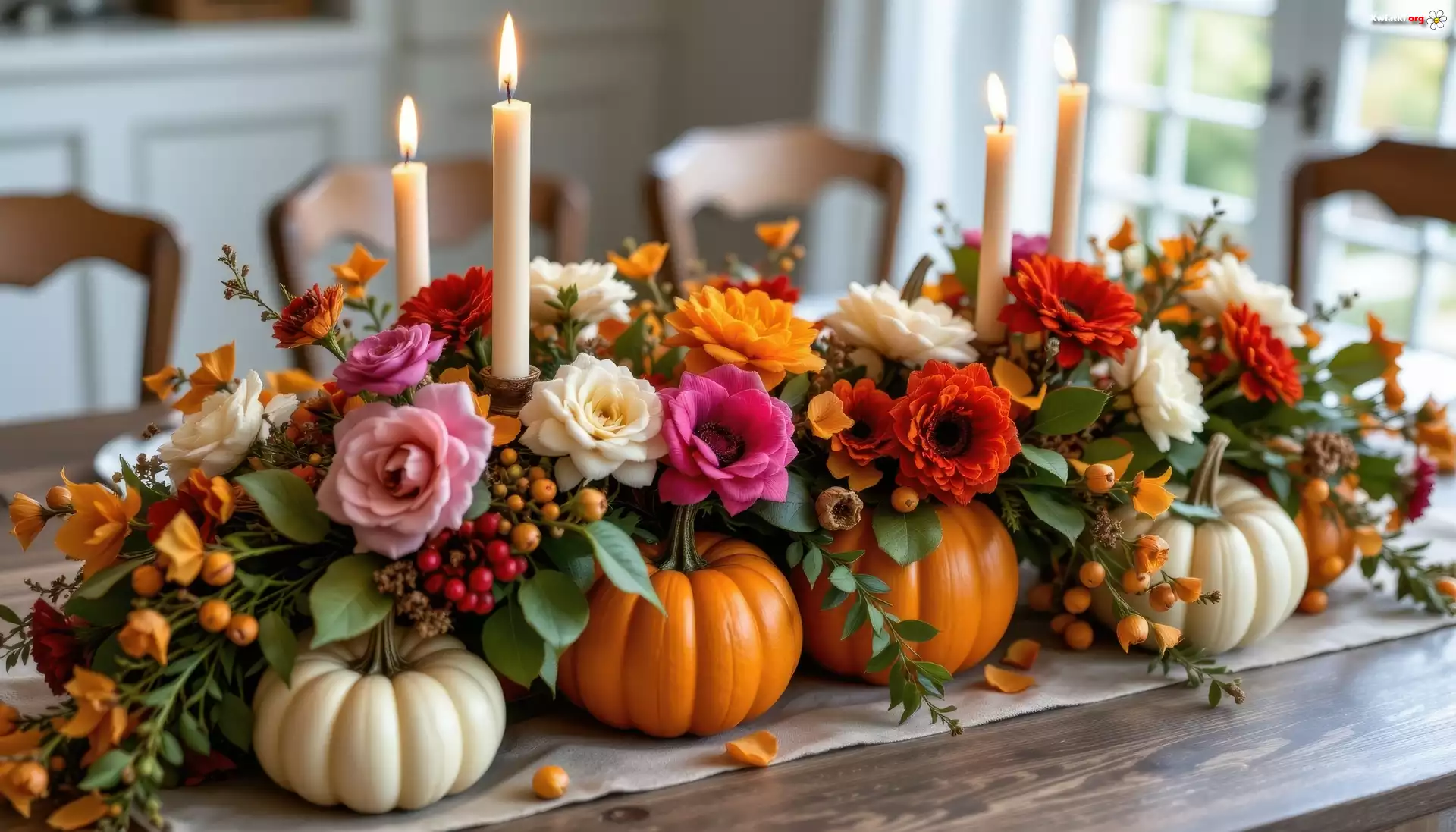 Stół, Kolorowe, Kwiaty, Dynie, Świece, Kompozycja - Zdjęcia