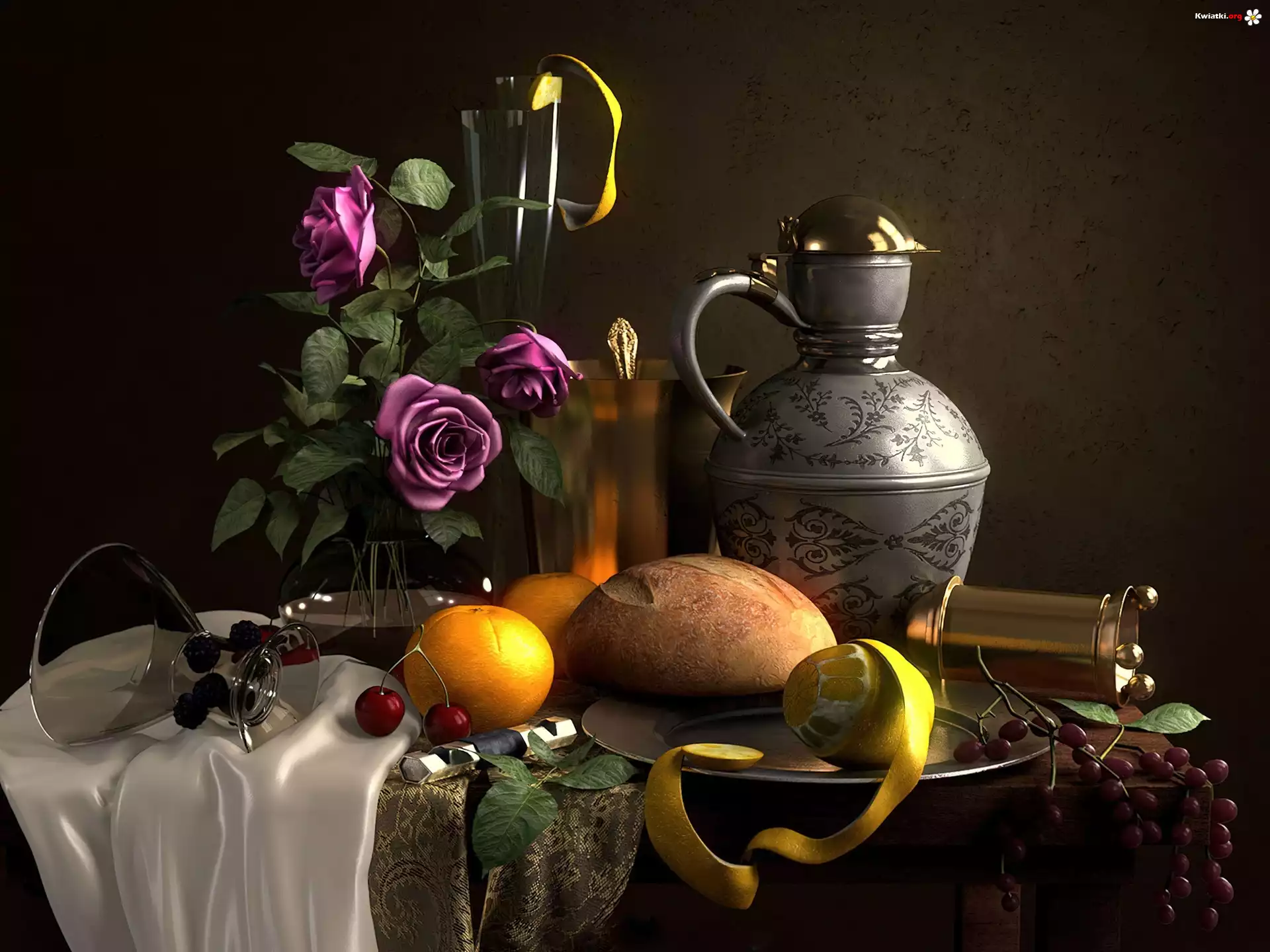 Kompozycja, Dzban, Kieliszek, Kwiaty, Chleb, Pomarańcz, Cytryna - Zdjęcia