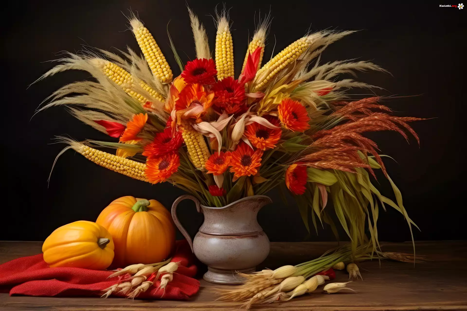 Kukurydza, Kwiaty, Bukiet, Dzbanek, Dynie, Jesienna, Kompozycja - Zdjęcia