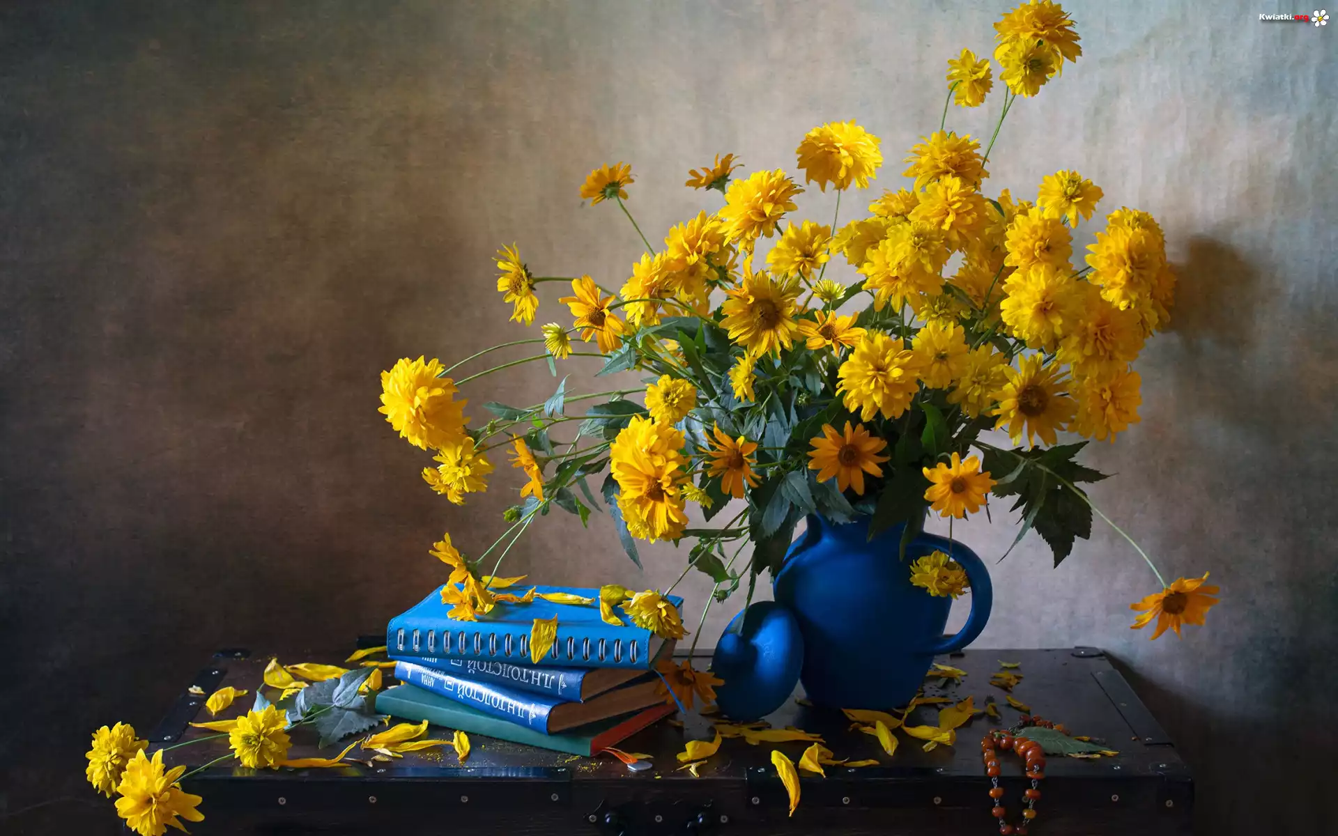 Kwiaty, Żółte, Bukiet, Dzbanek, Książki, Skrzynia, Kompozycja - Zdjęcia