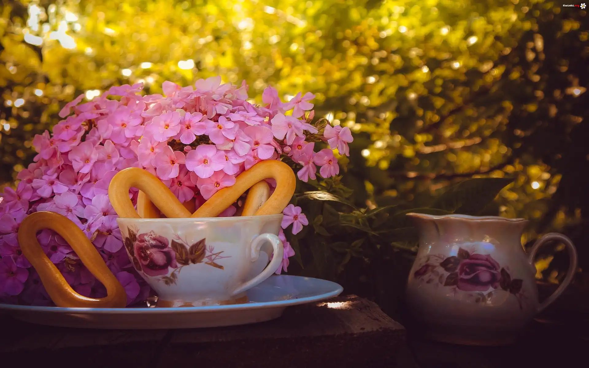 Filiżanka, Dzbanek, Kwiaty, Ławka, Ogród, Drzewa, Światło - Zdjęcia