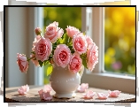 Kwiat Kwiaty, Róże, Różowe, Dzbanek, Stół, Okno