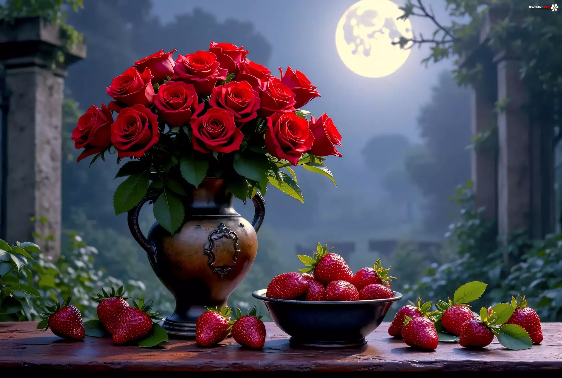 Róże, Dzbanek, Truskawki, Miska, Księżyc - Zdjęcia
