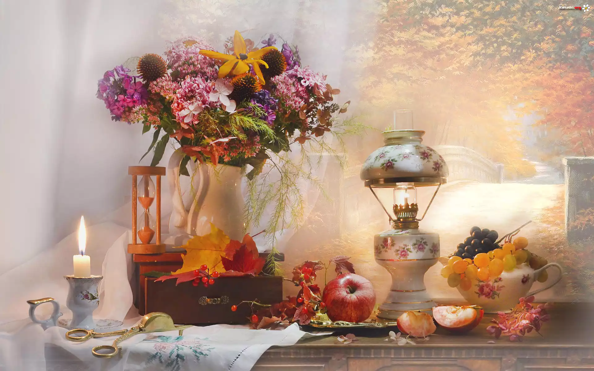 Kwiaty, Bukiet, Dzbanek, Liście, Świeca, Owoce, Jabłka, Winogrona, Lampa, Jesienna, Kompozycja - Zdjęcia |