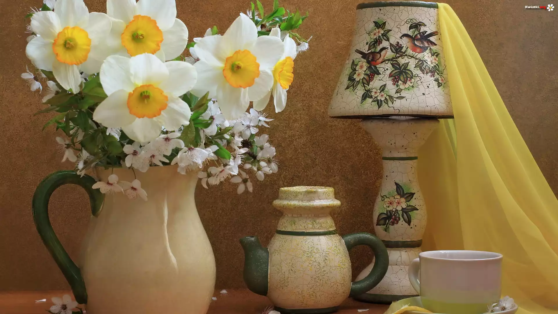 Dzbanki, Lampka, Filiżanka, Narcyze, Tkanina - Zdjęcia