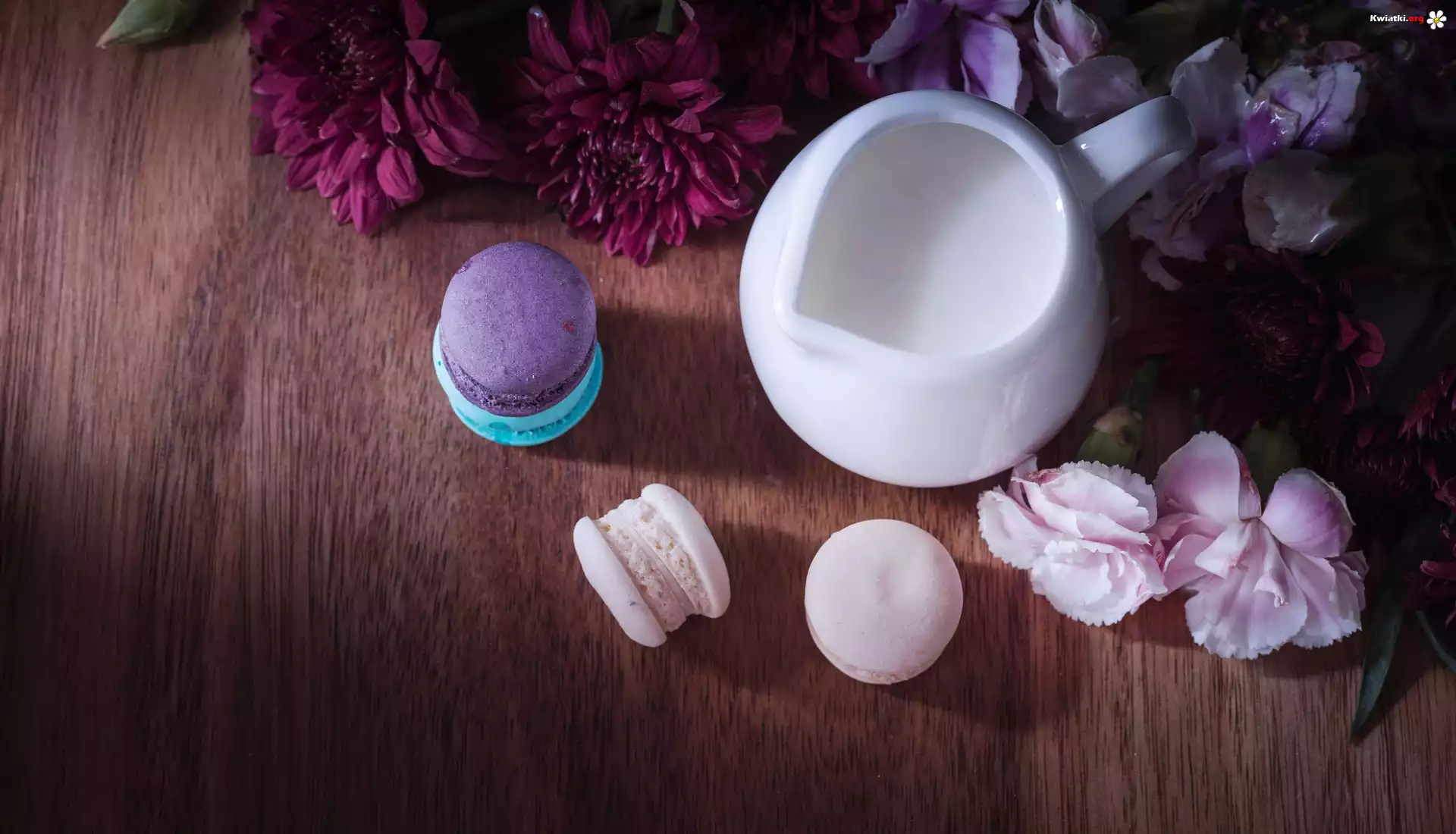 Dzbanuszek, Mleko, Makaroniki, Kwiaty, Chryzantemy, Goździki - Zdjęcia
