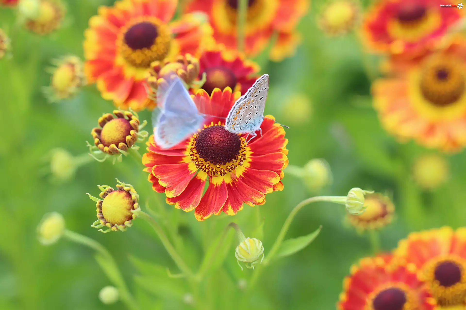 Kwiat Dzielżan ogrodowy, Czerwone, Kwiaty, Motyle, Modraszki