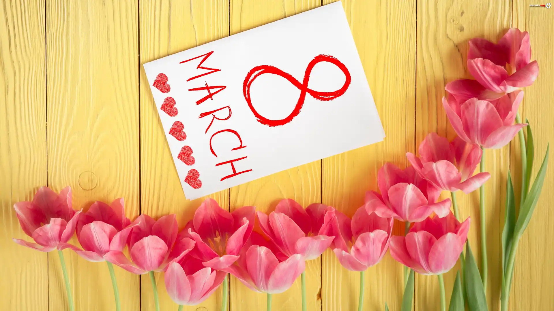 Dzień Kobiet, Różowe, Tulipany, Kartka, Deski - Zdjęcia