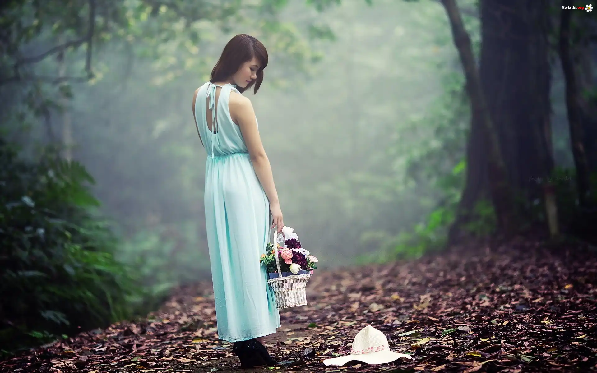 Kwiat Dziewczyna, Las, Liście, Mgła, Koszyk, Kwiaty