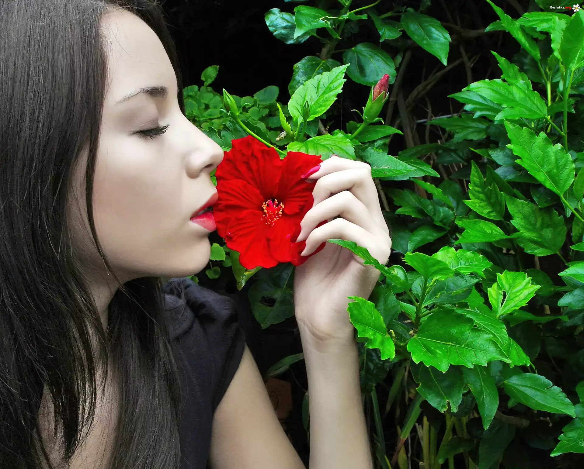 Kwiat Dziewczyna, Profil, Czerwony, Kwiat, Hibiskusa
