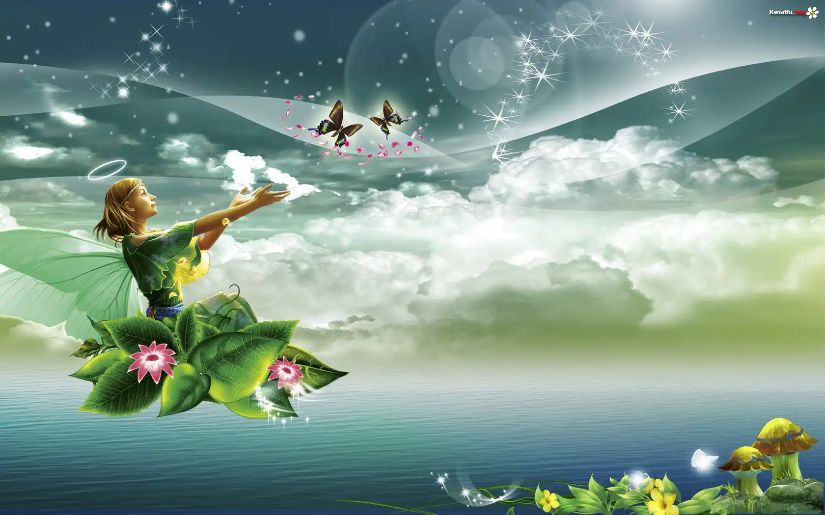Kwiat Dziewczyna, Elf, Liście, Motyle, Chmury