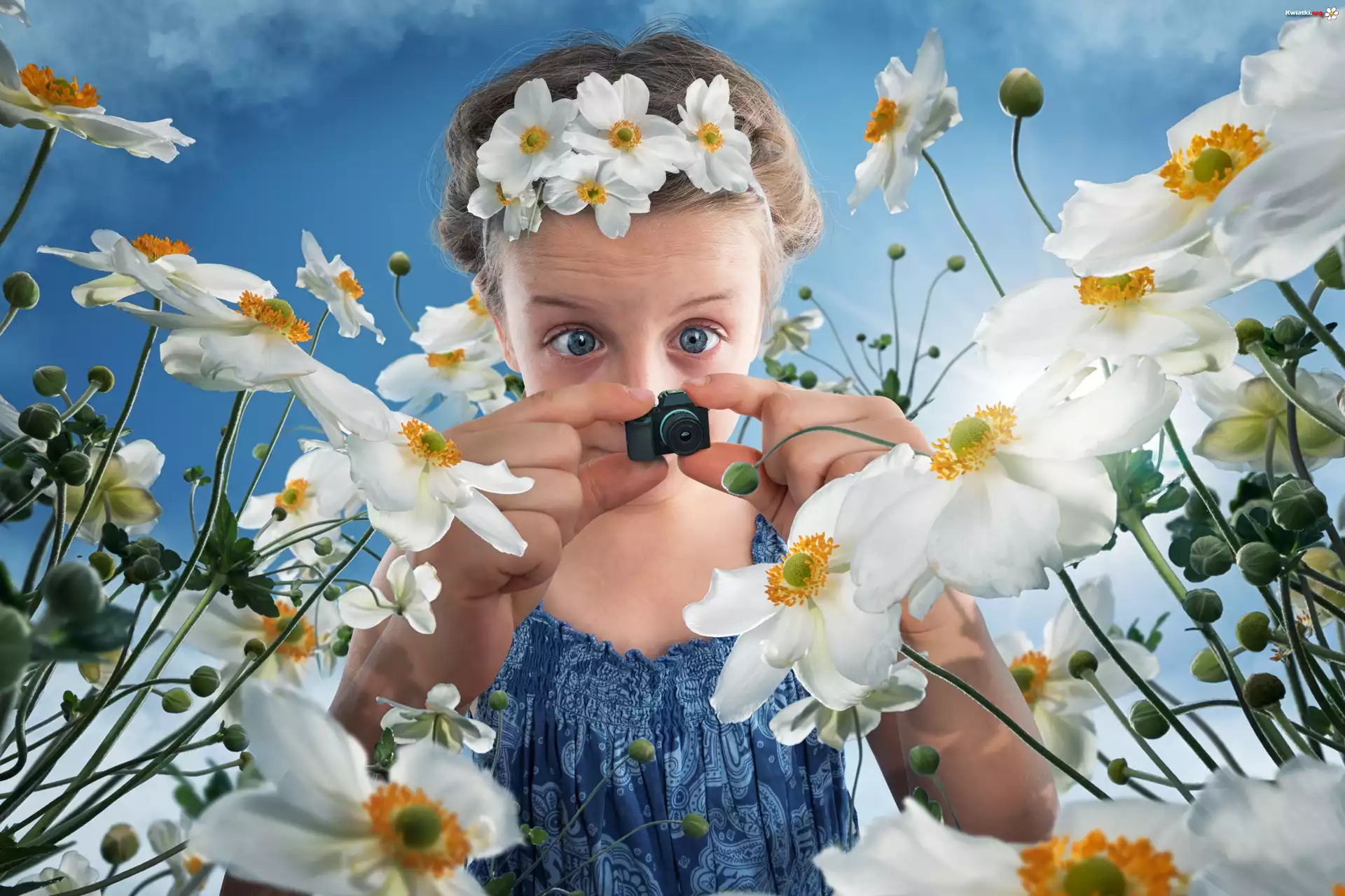 Kwiat Dziewczynka, Kwiaty, Zawilce, Aparat fotograficzny, Śmieszne