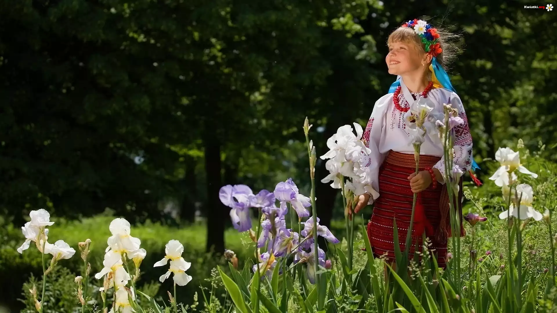 Kwiat Dziewczynka, Wianek, Strój, Ludowy, Irysy, Drzewa