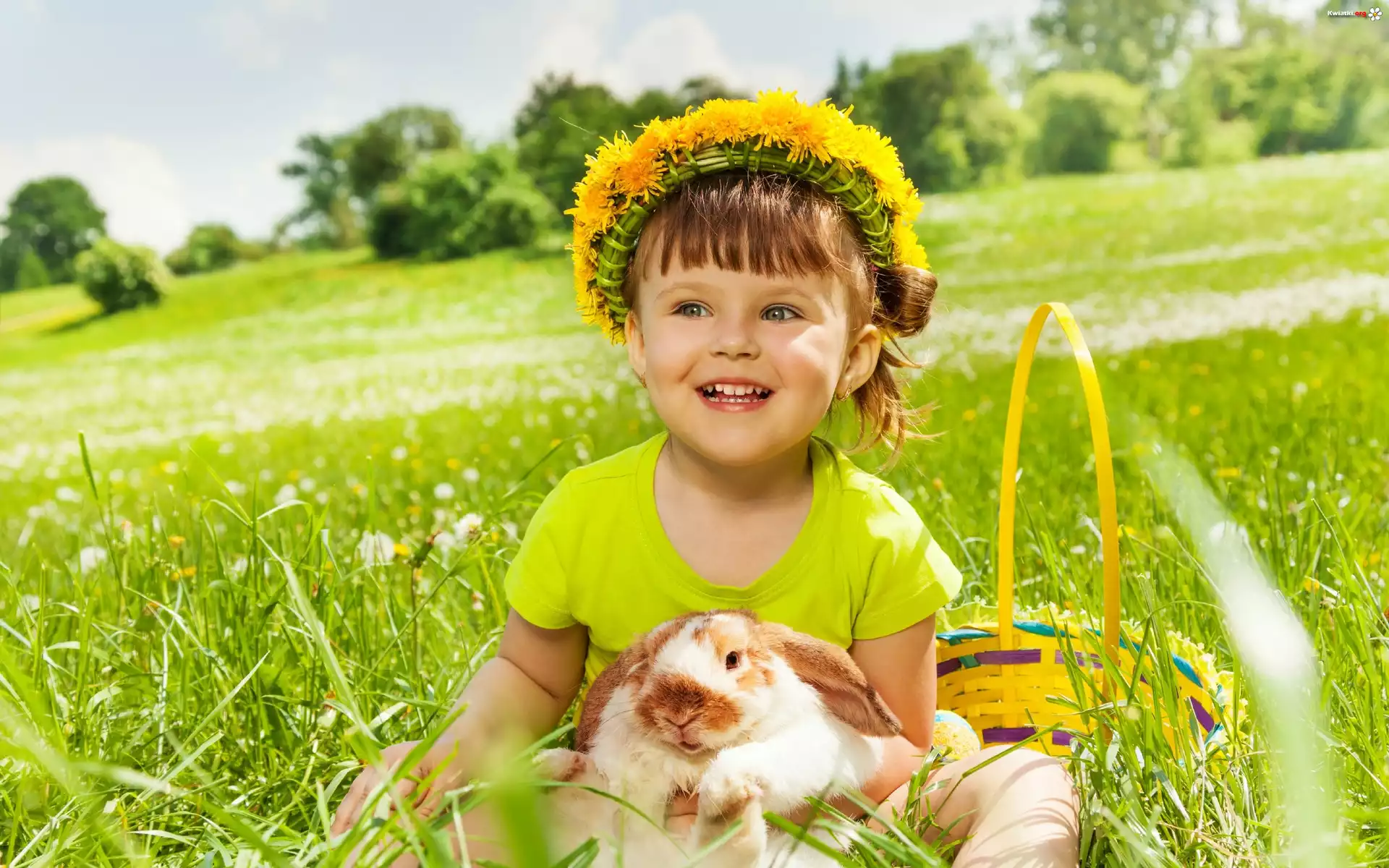 Dziewczynka, Łąka, Wianuszek, Mlecze, Królik, Koszyk - Zdjęcia