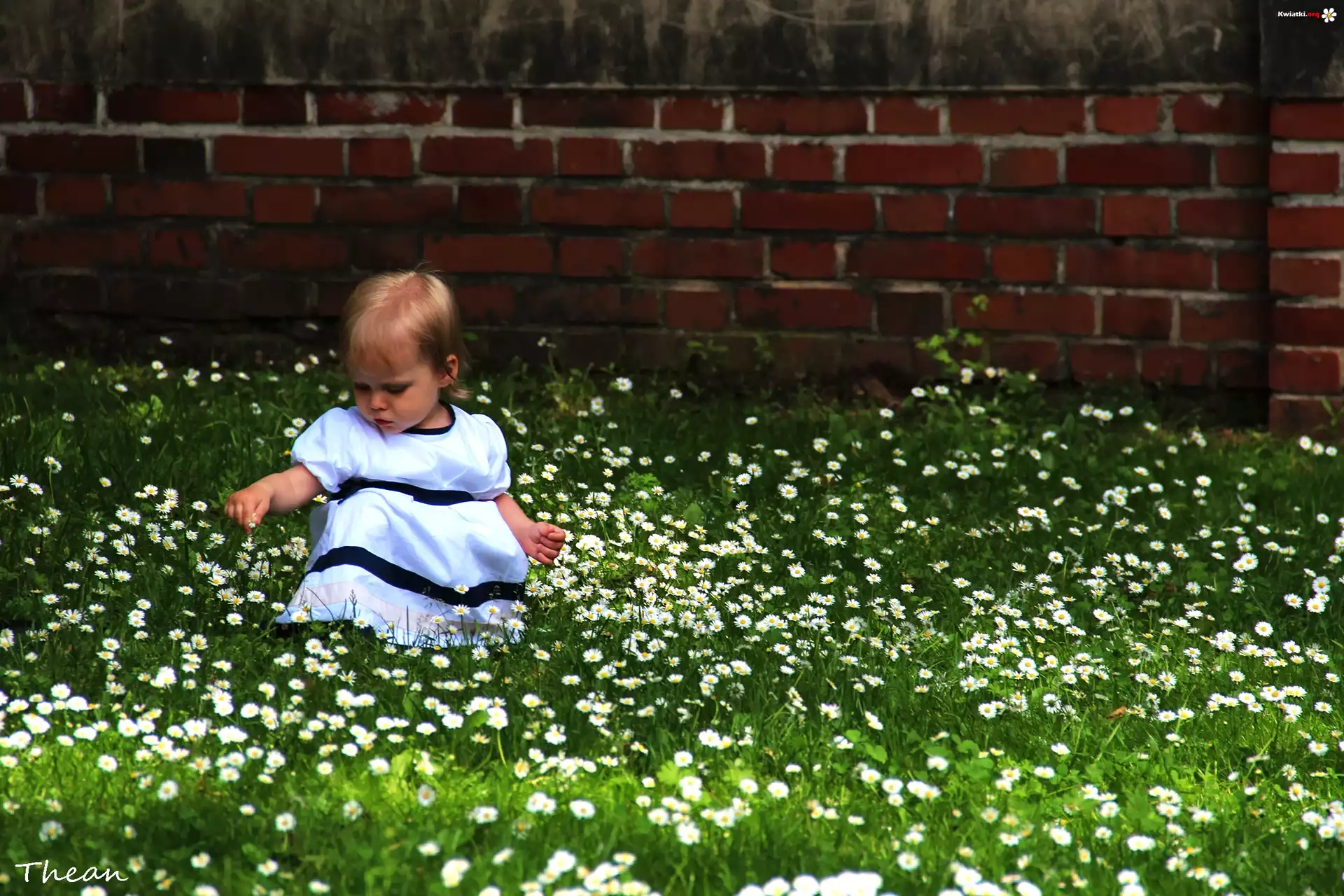 Kwiat Mała, Dziewczynka, Sukienka, Trawa, Stokrotki, Mur, Cegły