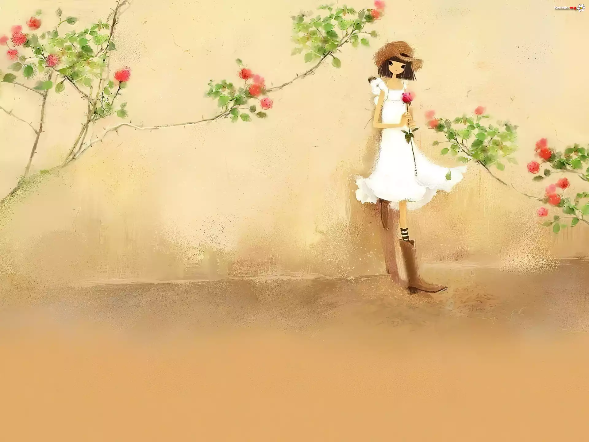 Kwiat Dziewczynka, W, Białej, Sukience, Róże