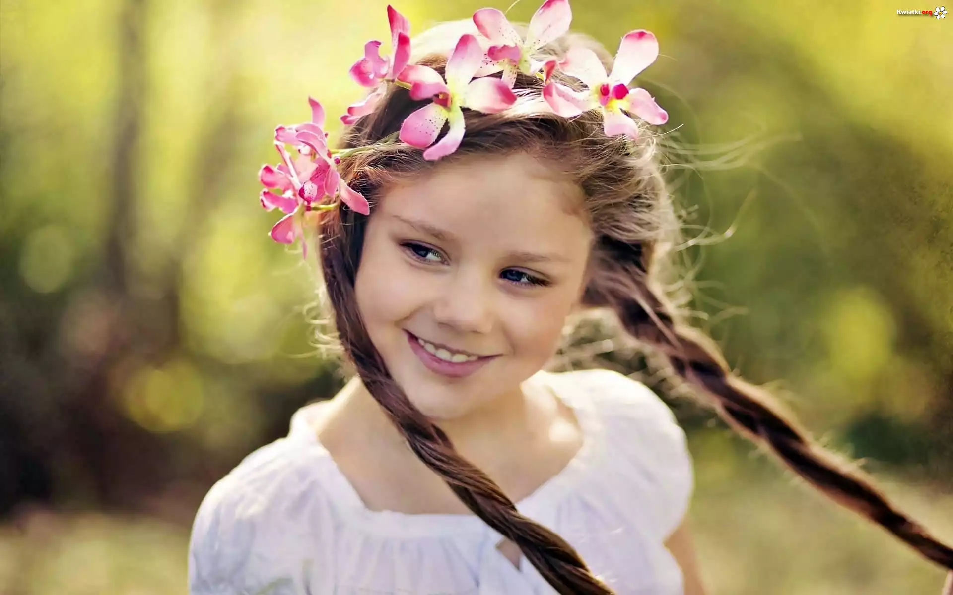 Kwiat Dziewczynka, Uśmiech, Warkocze, Wianek, Rozmycie