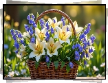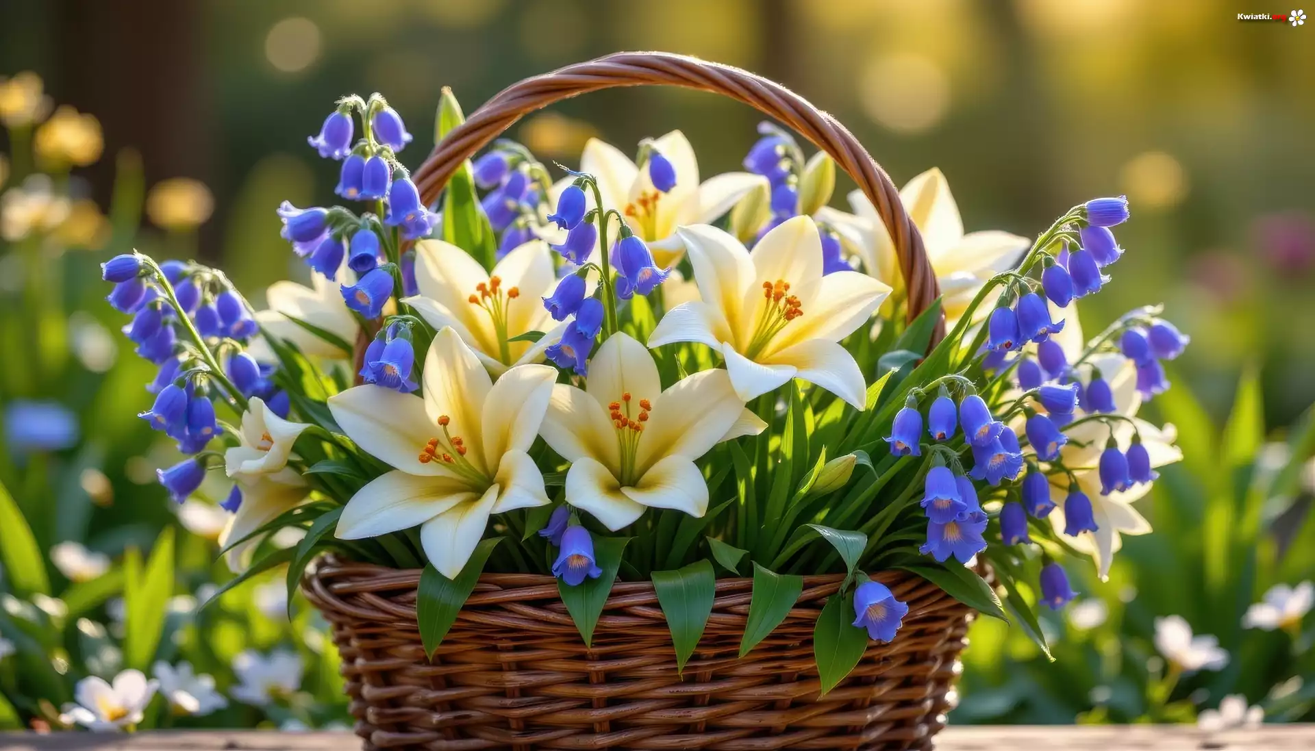 Kremowe, Lilie, Fioletowe, Dzwonki, Kwiaty, Wiklinowy, Koszyk - Zdjęcia