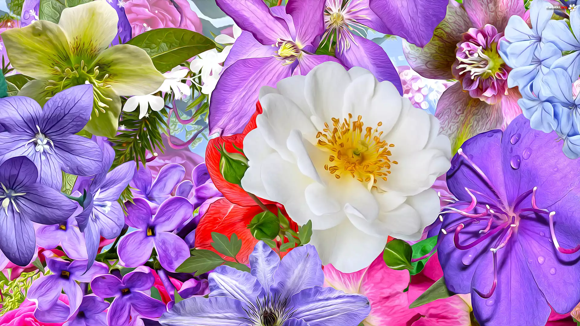 Kwiaty, Dzwonki, Powojnik, Dzika róża, Bez, Grafika - Zdjęcia