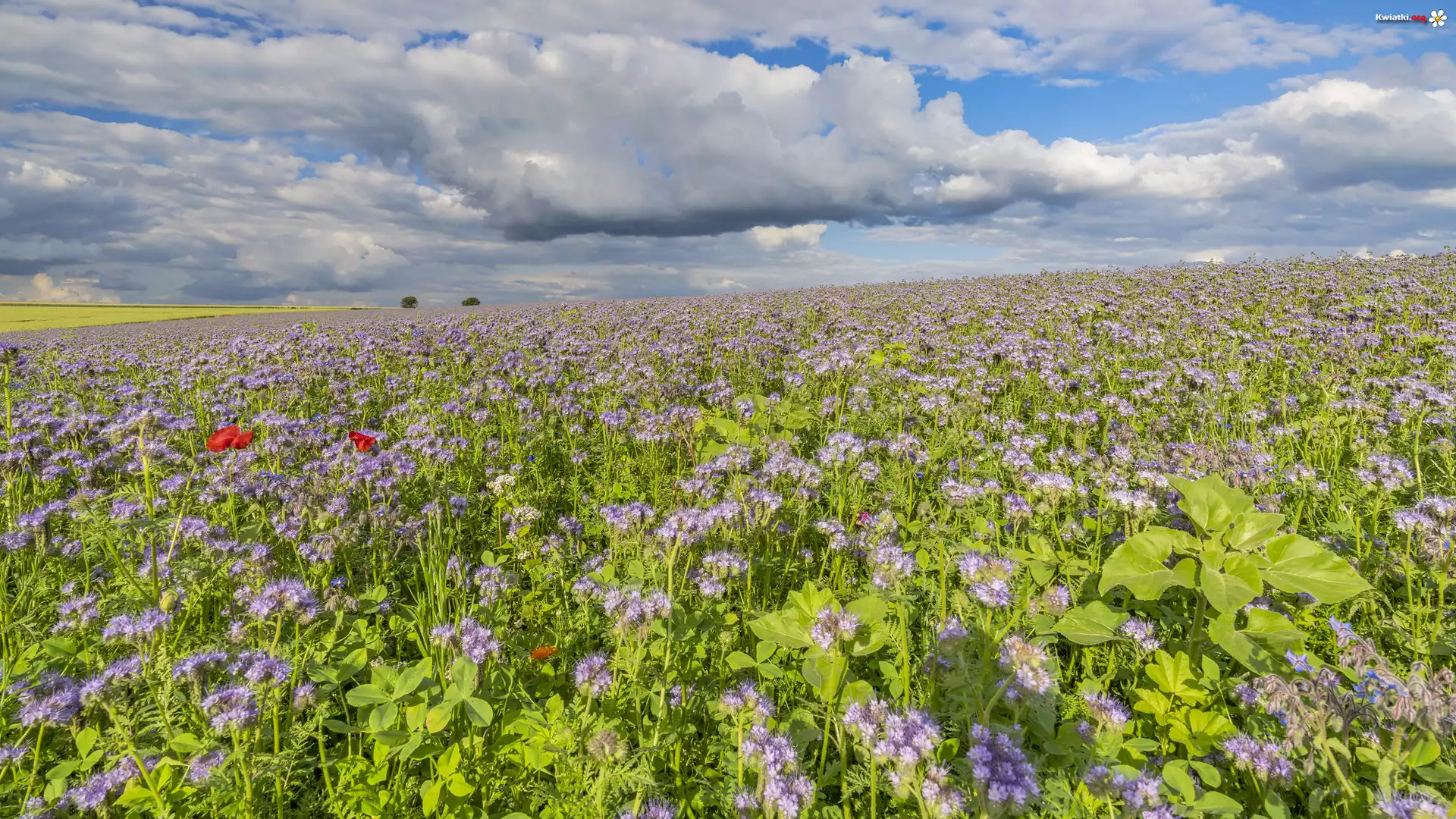 Lato, Pole, Kwiaty, Facelia, Drzewa, Chmury - Zdjęcia