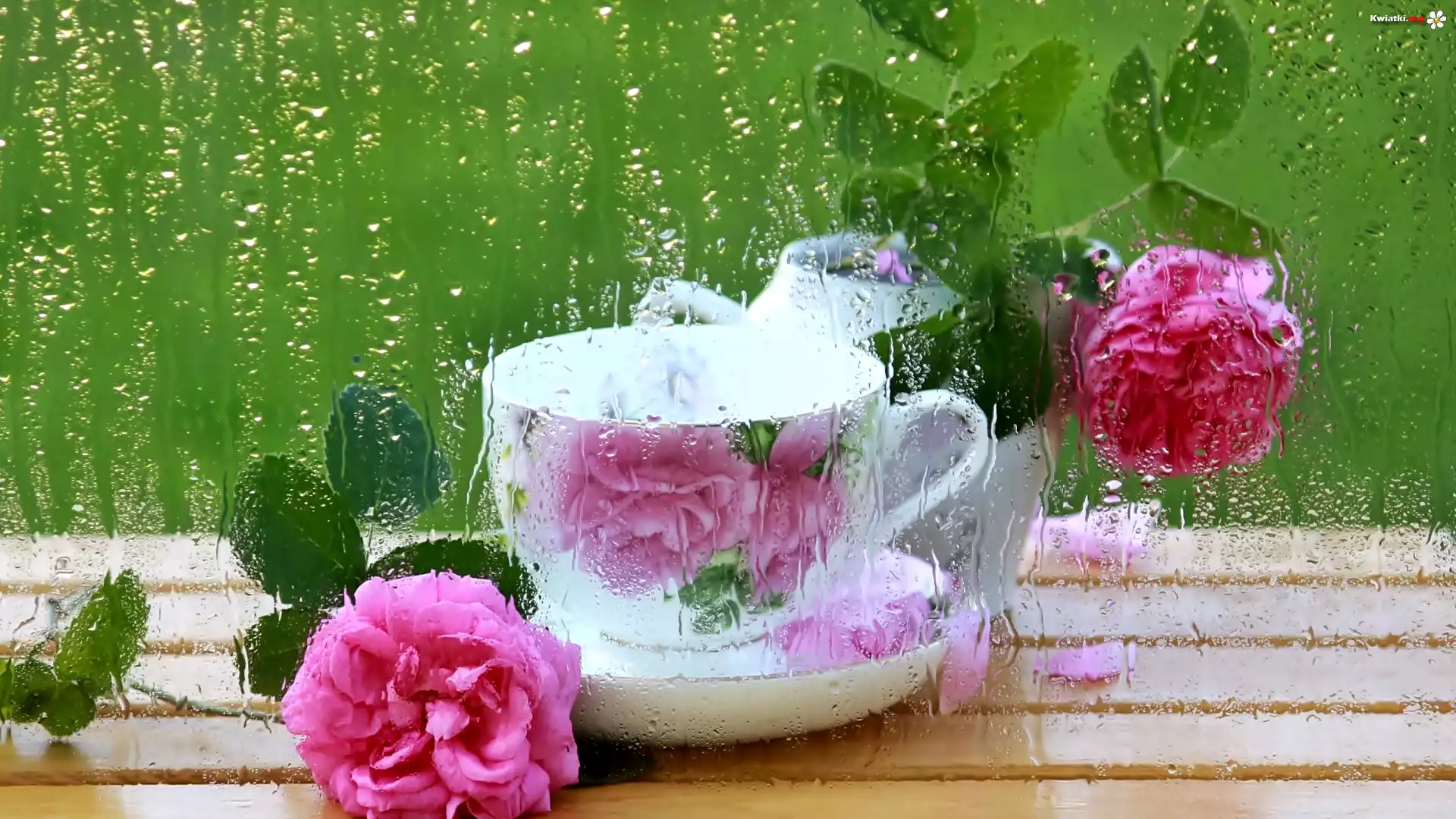 Filiżanka, Herbaty, Róże, Ławka, Deszcz - Zdjęcia