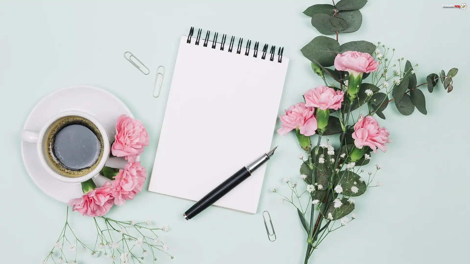 Kwiat Filiżanka, Kawa, Goździki, Spinacze, Notes, Pióro