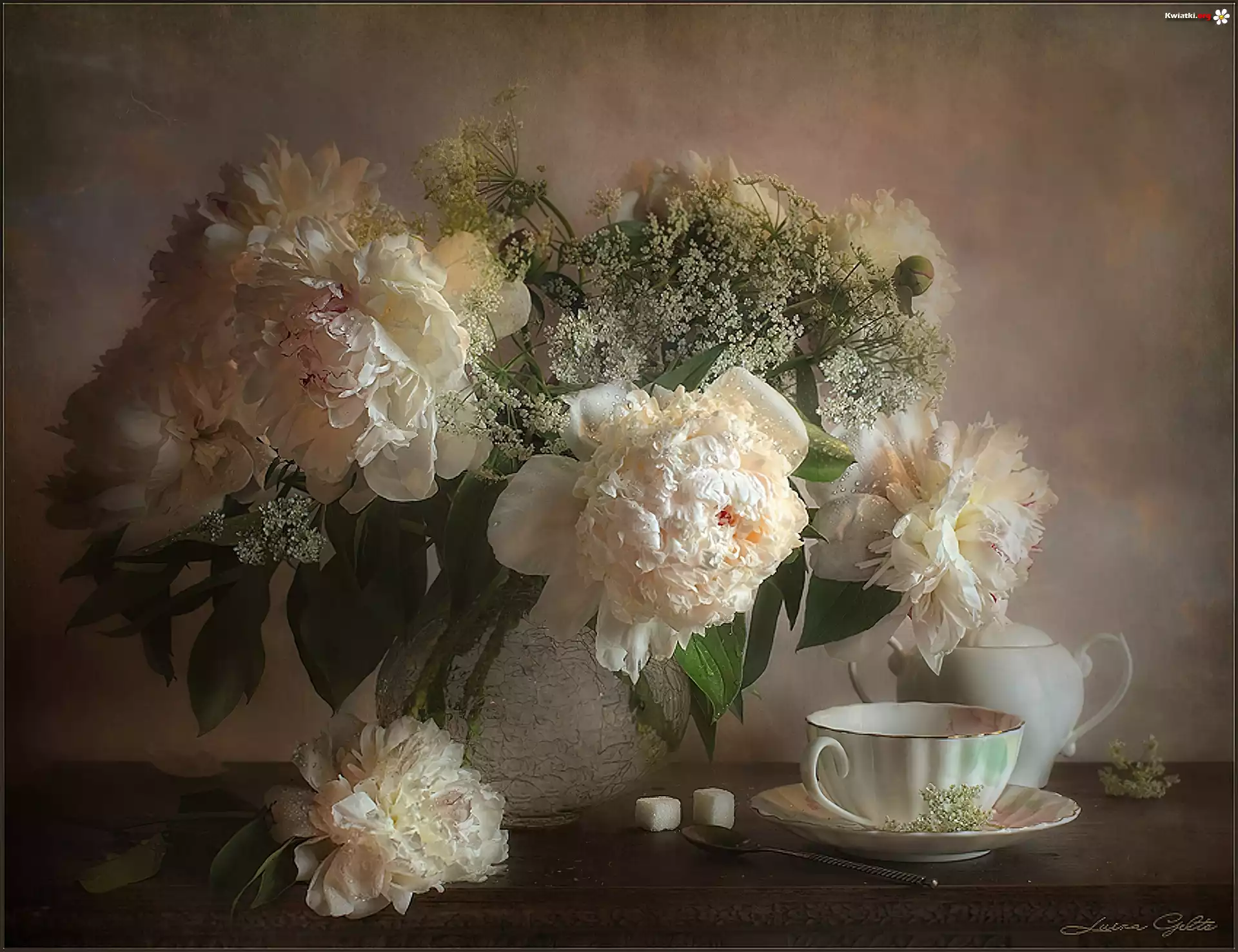 Piwonie, Filiżanka, Imbryk - Zdjęcia
