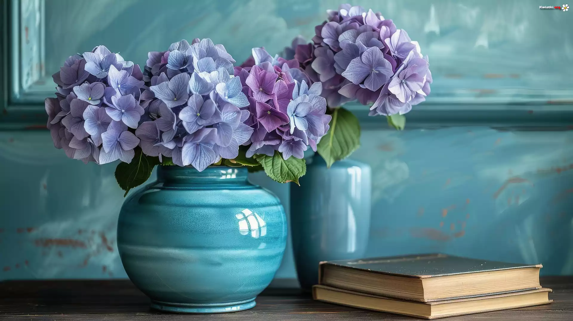 Kwiaty, Fioletowe, Hortensje, Wazony, Książki - Zdjęcia