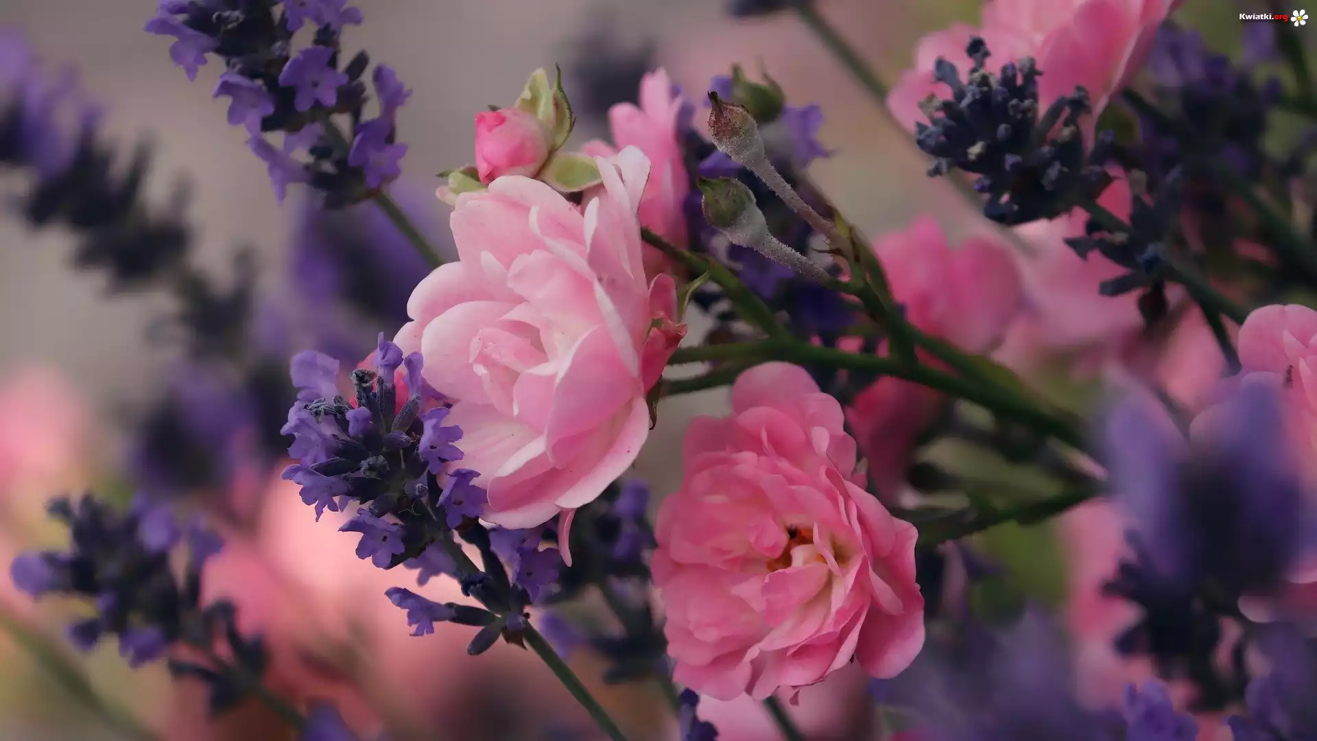 Fioletowe, Różowe, Kwiaty, Lawenda, Róże - Zdjęcia