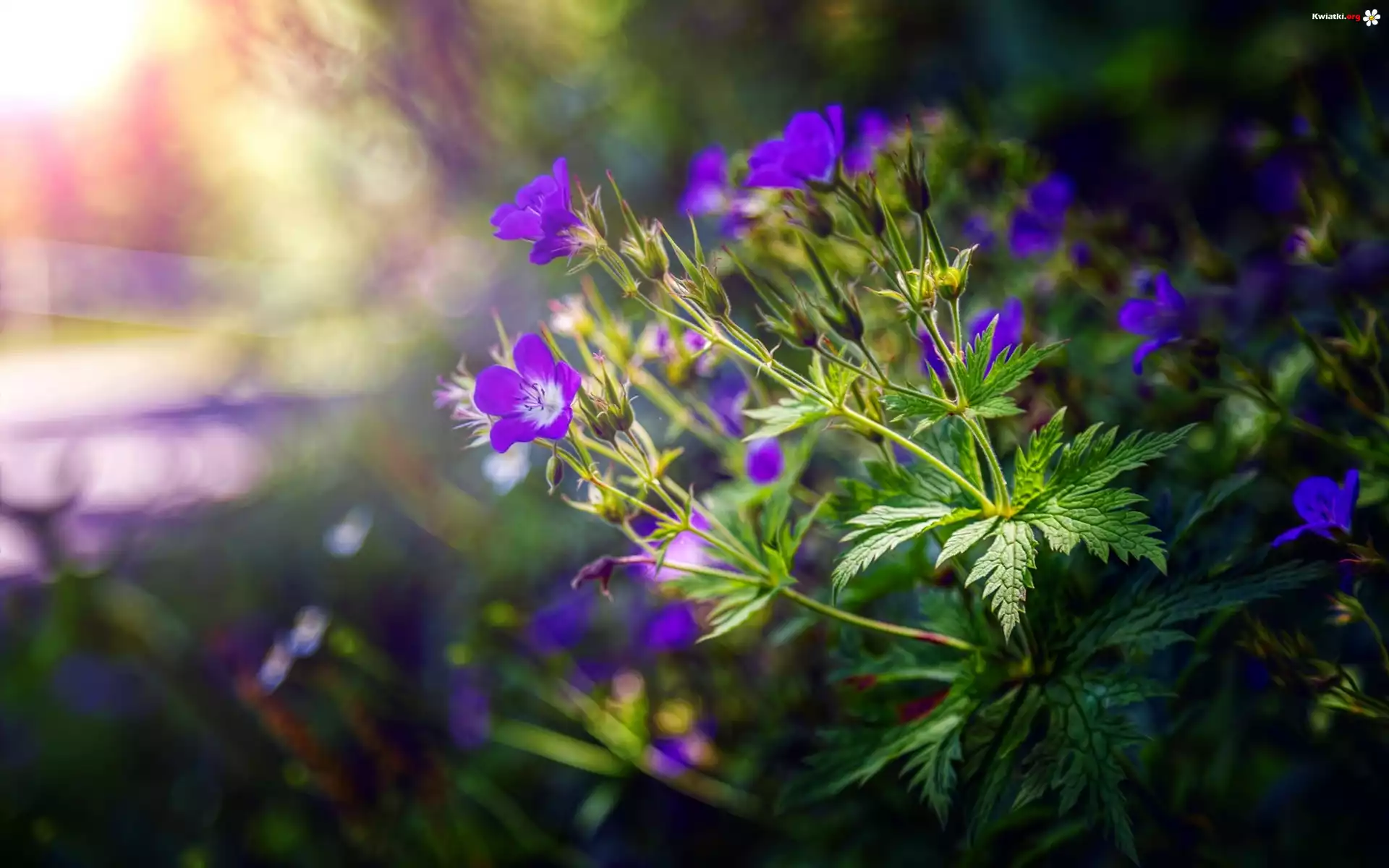 Kwiat Fioletowe, Kwiatki, Liście, Światło