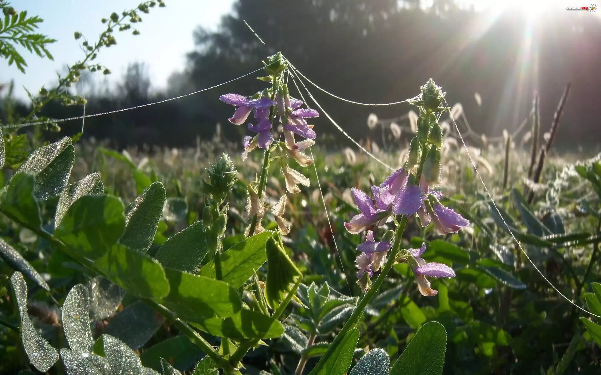 Fioletowe, Kwiaty, Rosa, Pajęczyna, Promienie - Zdjęcia