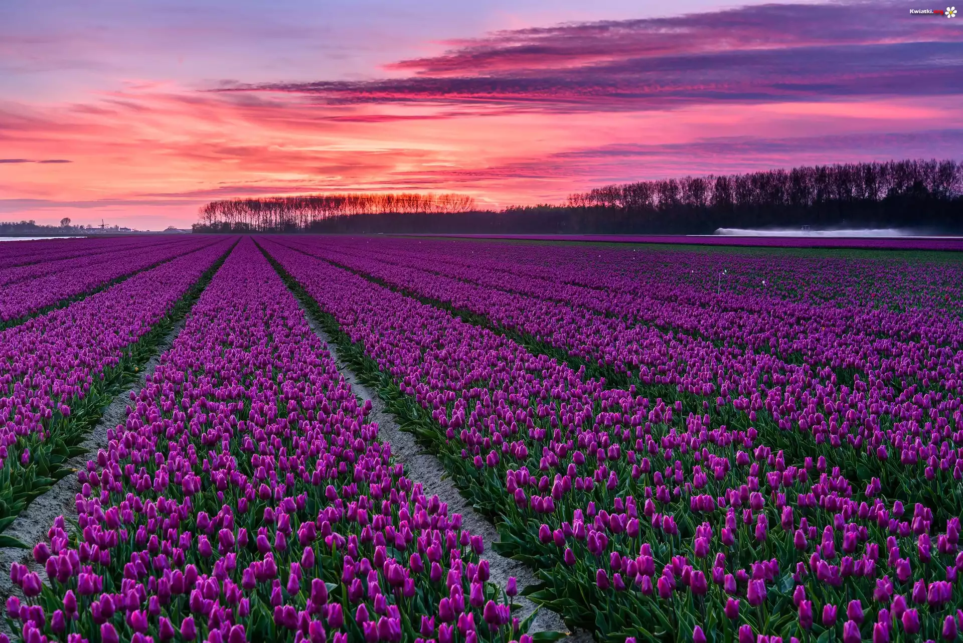 Pole, Fioletowe, Tulipany, Plantacja, Drzewa, Zachód słońca - Zdjęcia