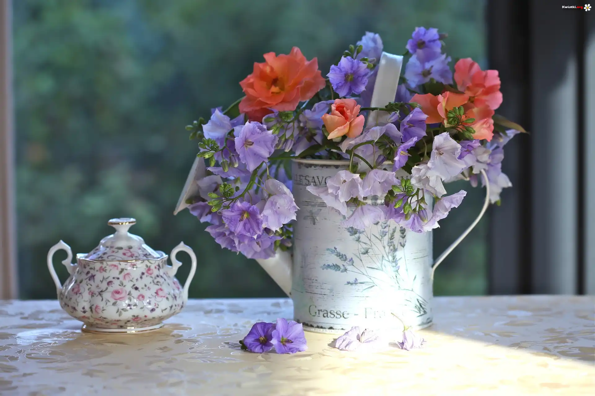 Kwiat Fioletowe, Czerwone, Kwiaty, Konewka, Porcelana, Stół