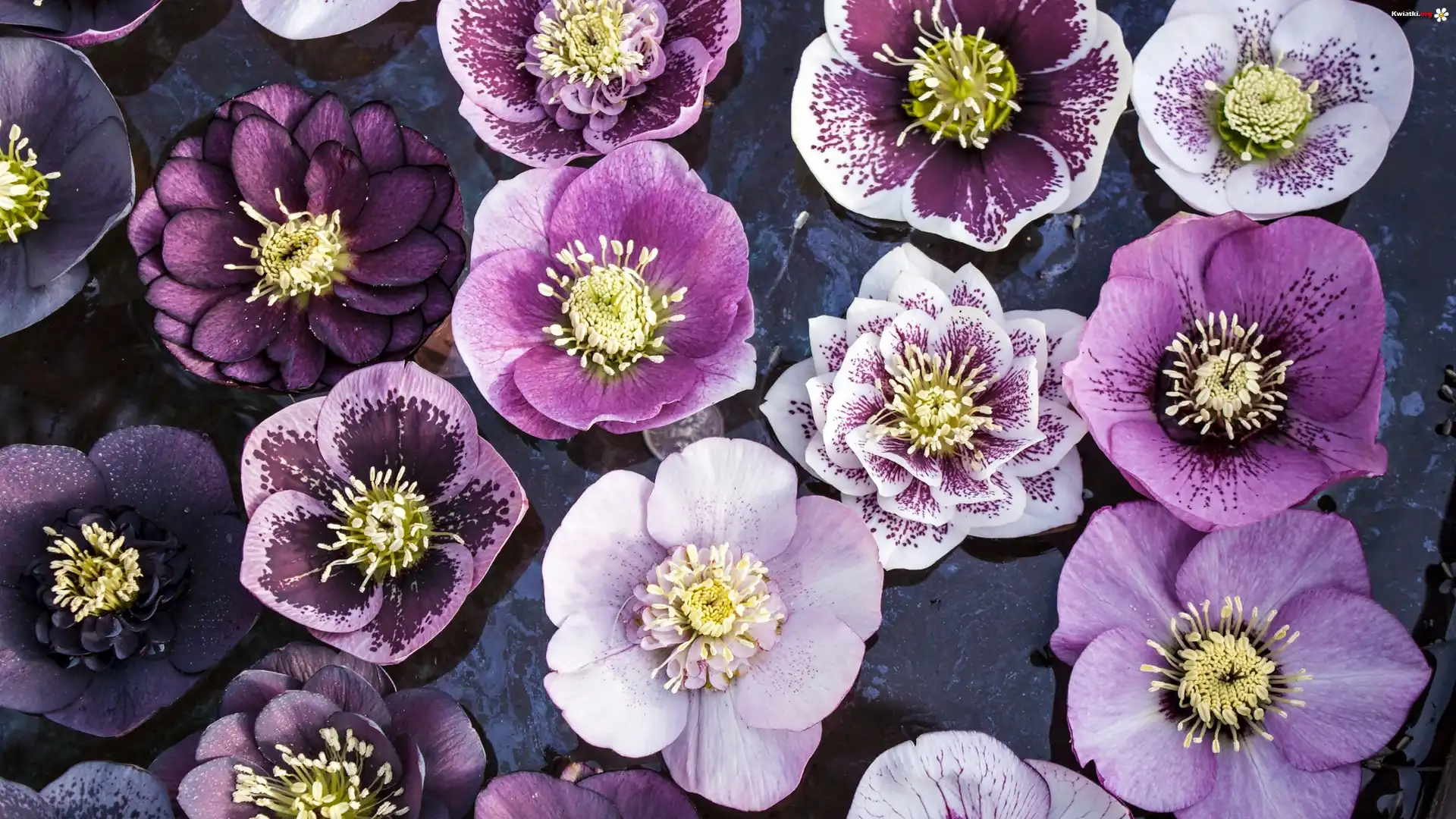 Fioletowe, Kwiaty, Woda, Ciemiernik - Zdjęcia