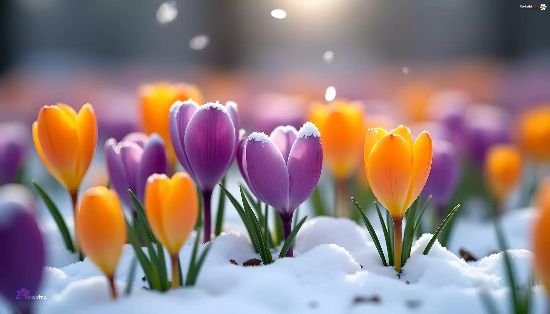 Kwiat Krokusy, Fioletowe, Żółte, Grafika, Śnieg