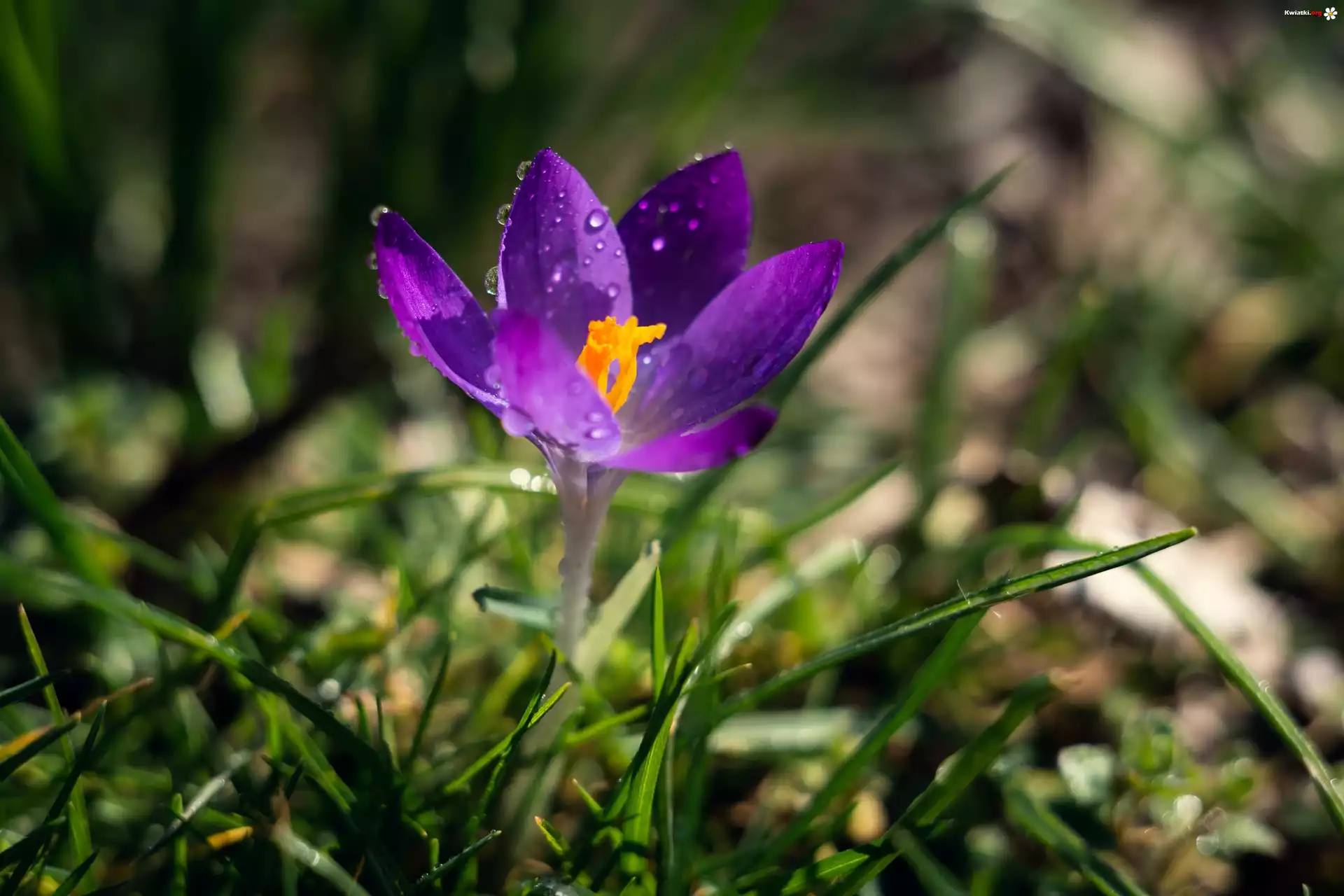 Kwiat Kwiat, Fioletowy, Krokus, Krople, Trawa