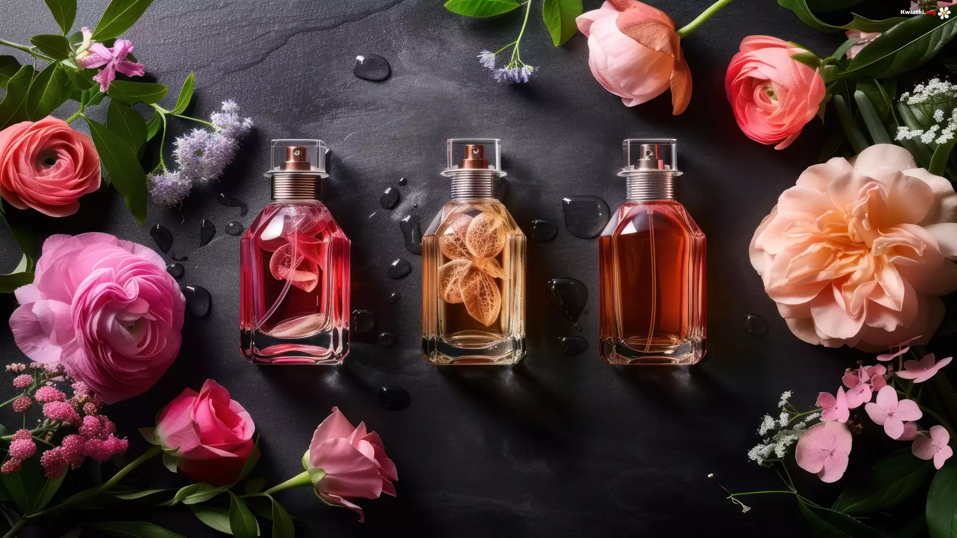 Perfumy, Flakon, Kwiaty, Ciemne, Tło - Zdjęcia