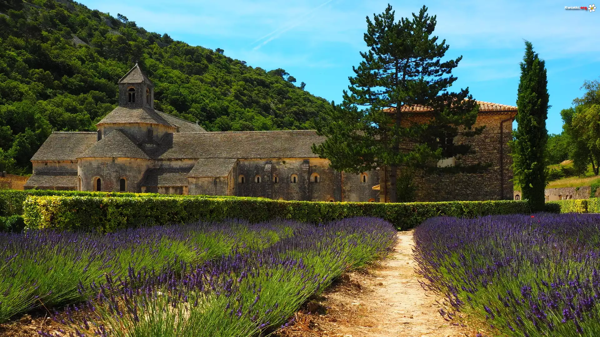 Kwiat Klasztor, Opactwo Senanque, Drzewa, Lawenda, Gordes, Prowansja, Francja