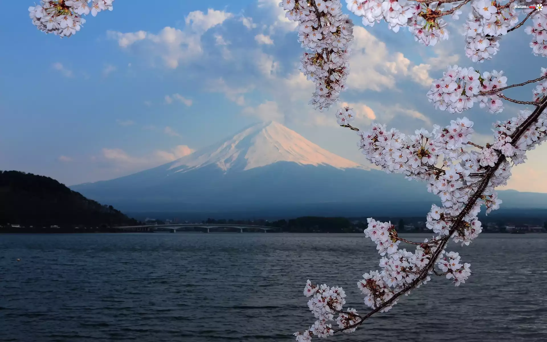 Kwiat Góra, Fudżi, Wulkan, Jezioro, Most, Kwitnące, Drzewo, Japonia