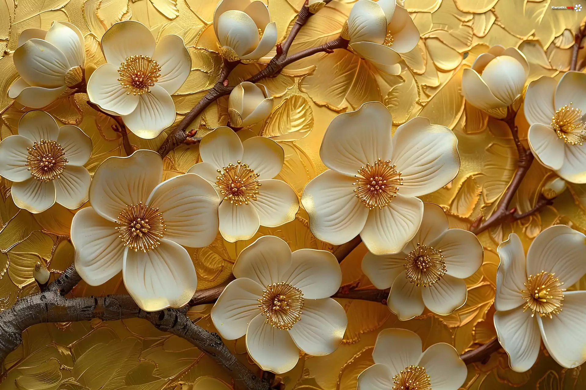 Biało-złote, Kwiaty, Gałązki, Tło, Grafika - Zdjęcia