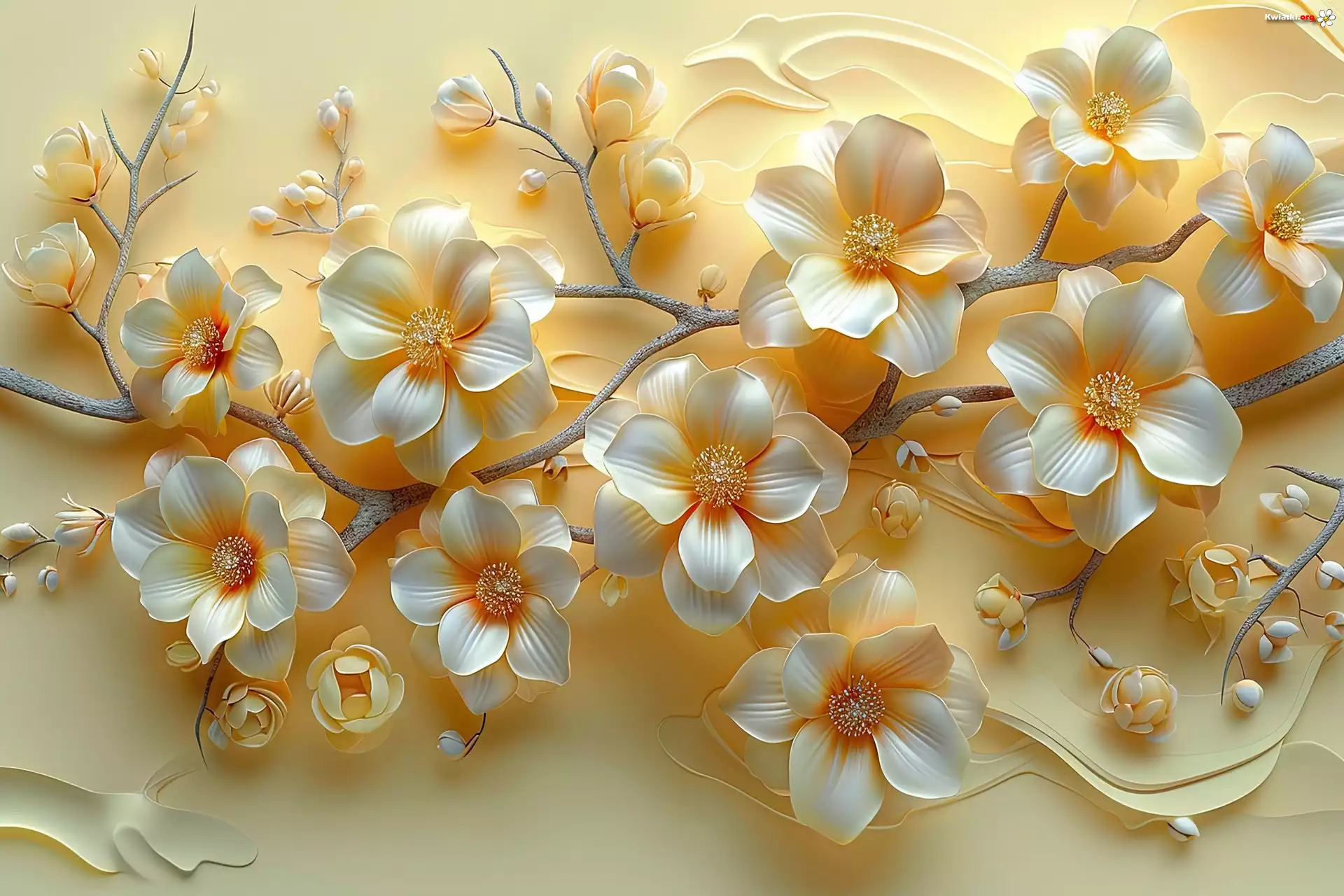 Biało-żółte, Kwiaty, Gałązki, Tło, Grafika - Zdjęcia