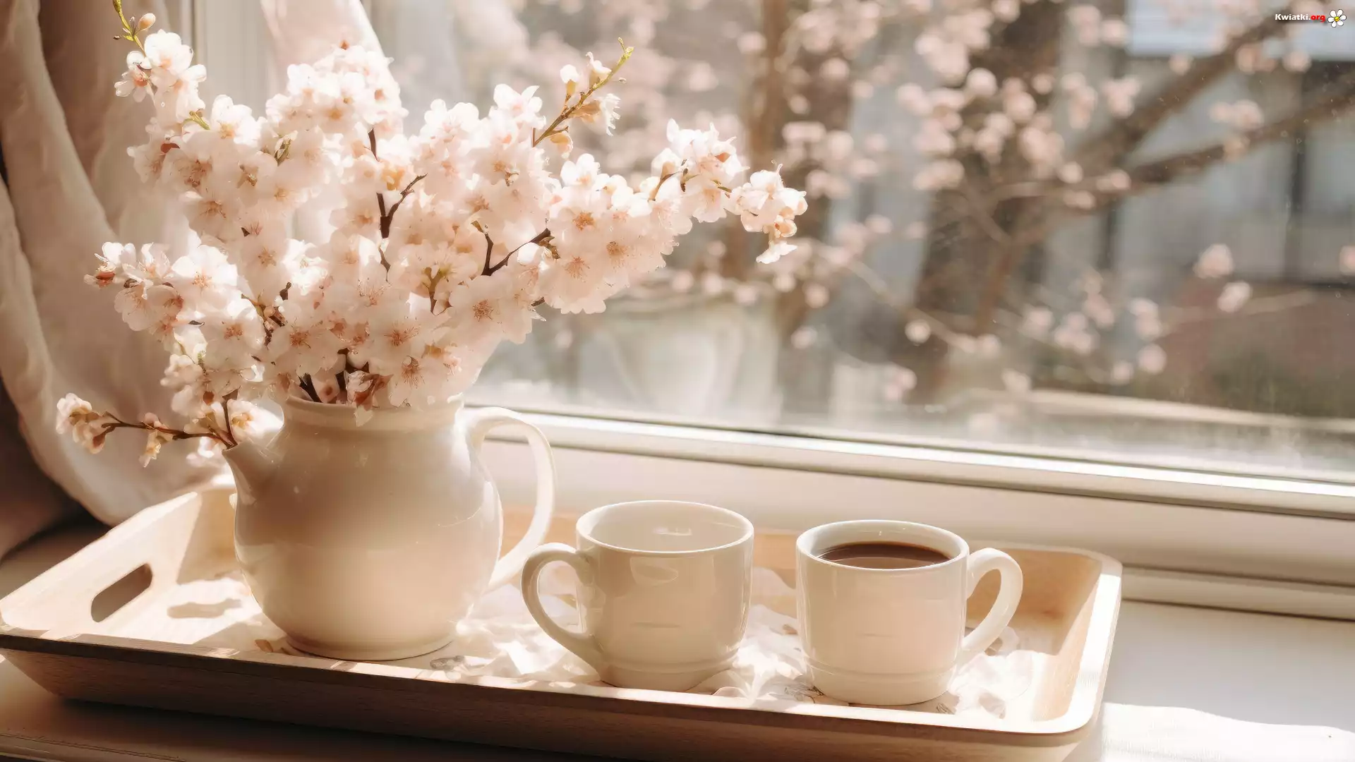 Kwiat Gałązki, Kwiaty, Drzewo owocowe, Dzbanek, Taca, Filiżanki, Parapet, Okno, Kompozycja