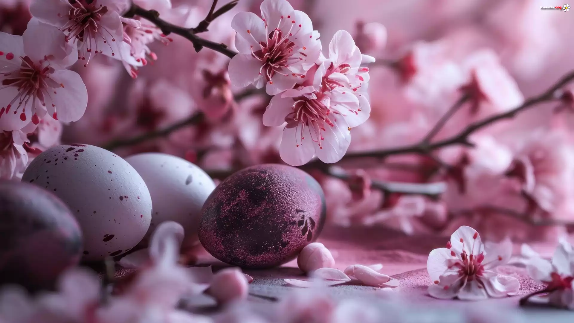 Wielkanoc, Bordowe, Pisanki, Gałązki, Czerwono-białe, Kwiaty - Zdjęcia