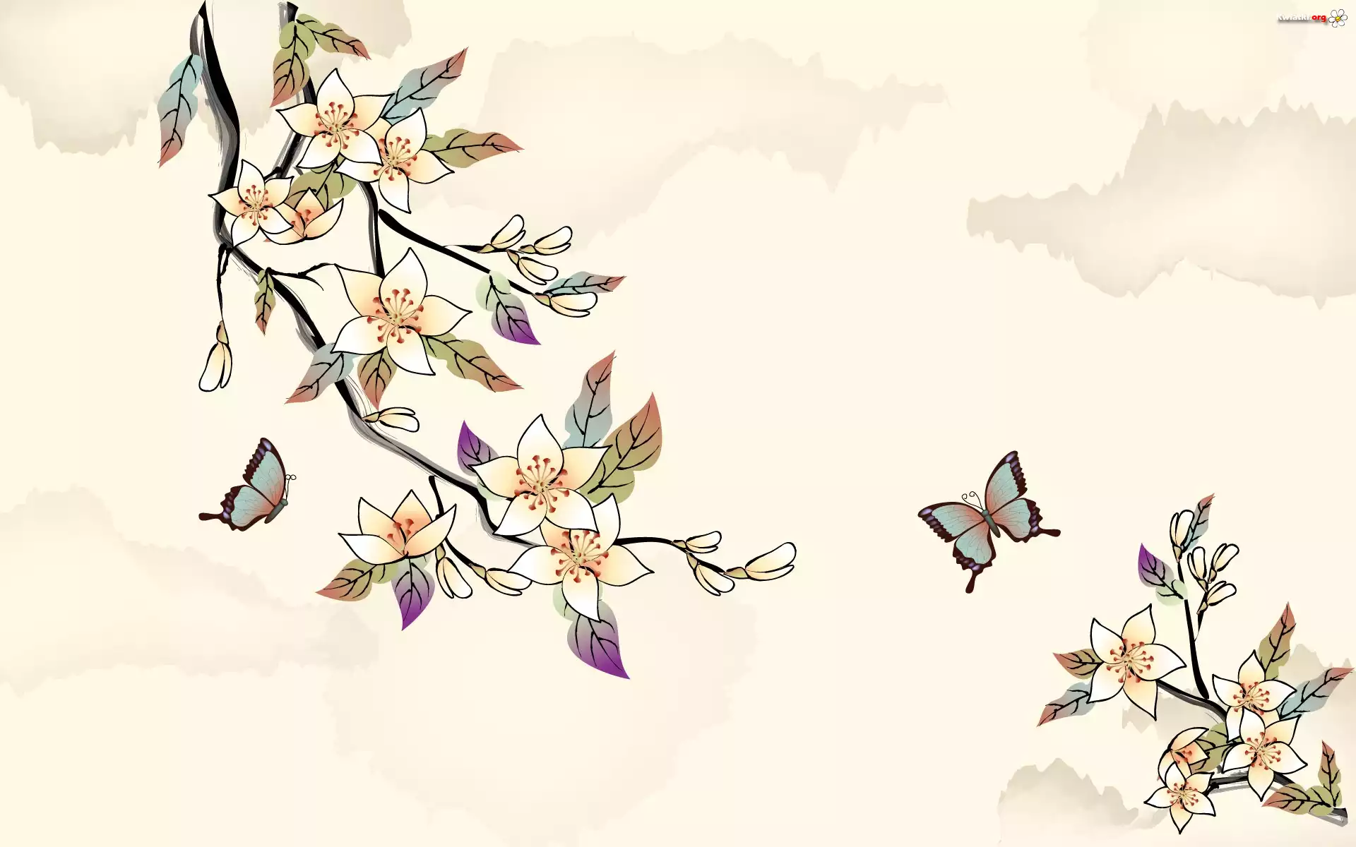 Gałązki, Kwitnące, Kwiaty, Biało, Pomarańczowe, Motyle - Zdjęcia