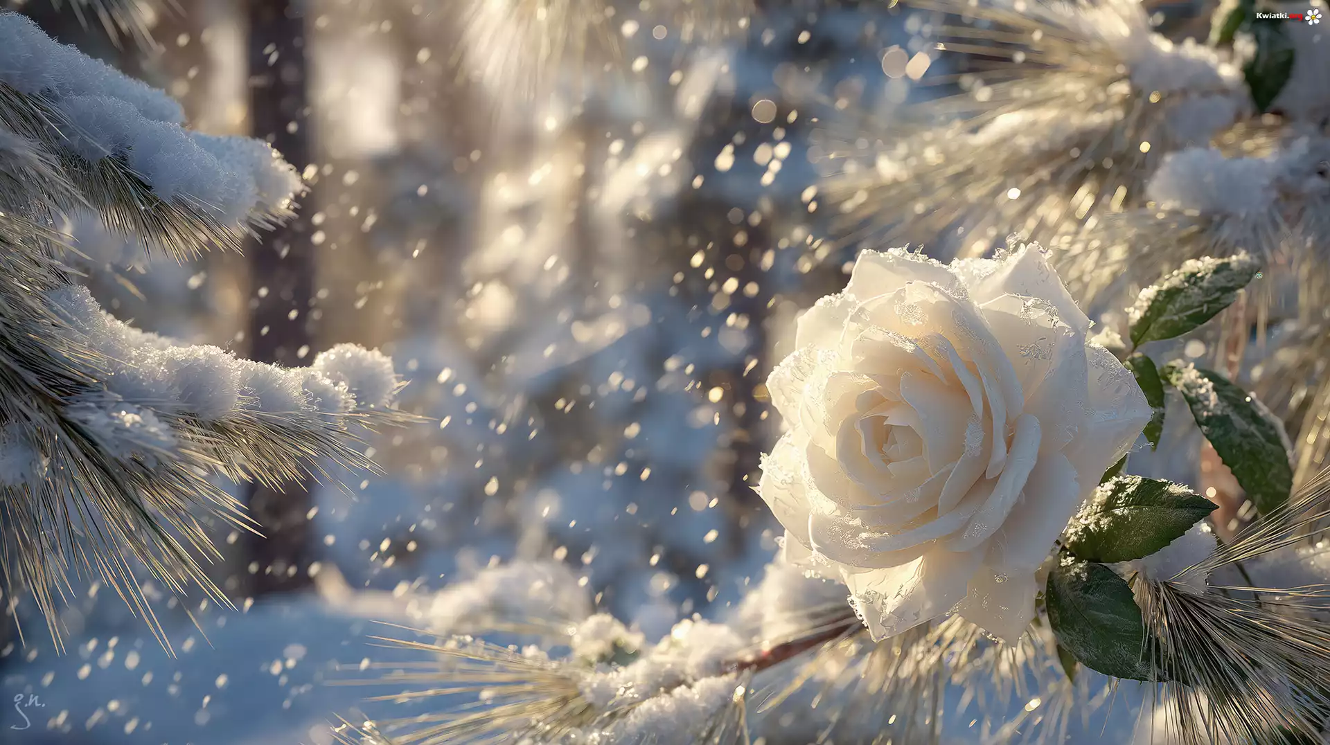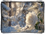 Kwiat Biała, Róża, Śnieg, Gałązki, Zima, Grafika AI