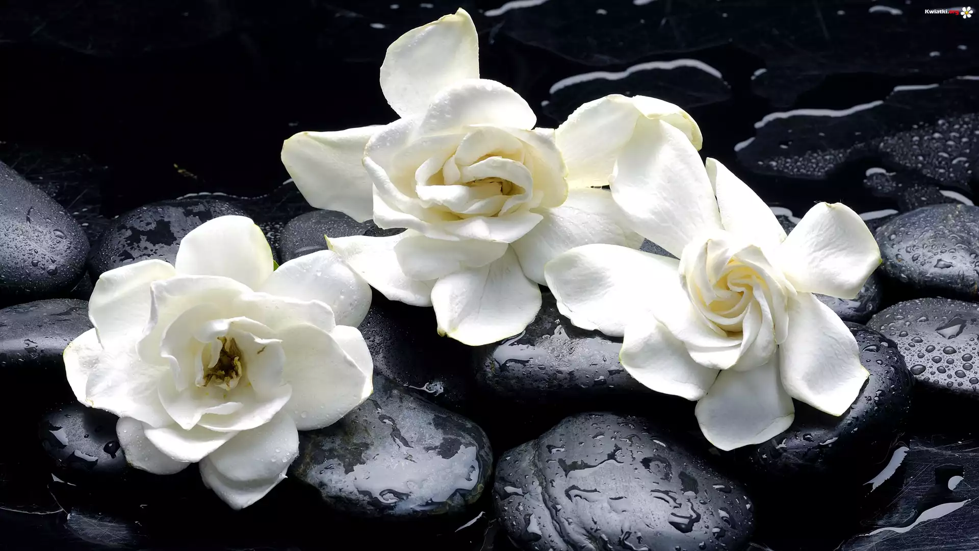 Gardenia jaśminowata, Trzy, Białe, Kwiaty, Kamienie - Zdjęcia