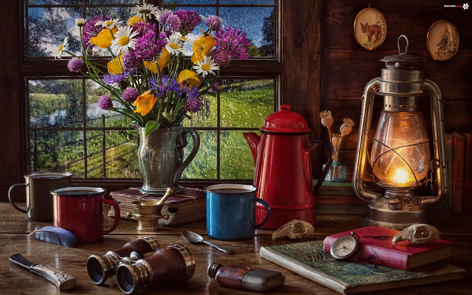 Kompozycja, Okno, Bukiet, Polne, Kwiaty, Lampa, Lornetka, Książka, Dzbanek, Garnuszki - Zdjęcia