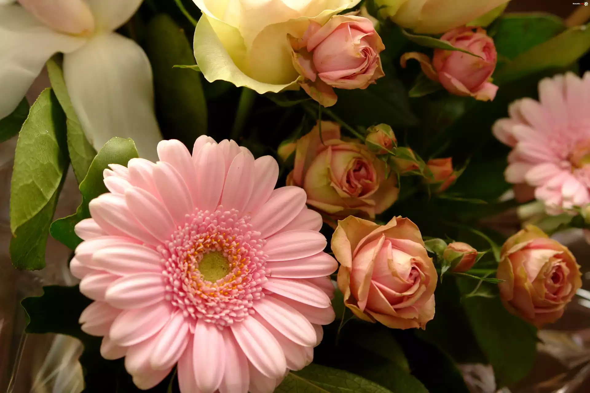 Gerbera, Róże, Pąki, Liście - Zdjęcia