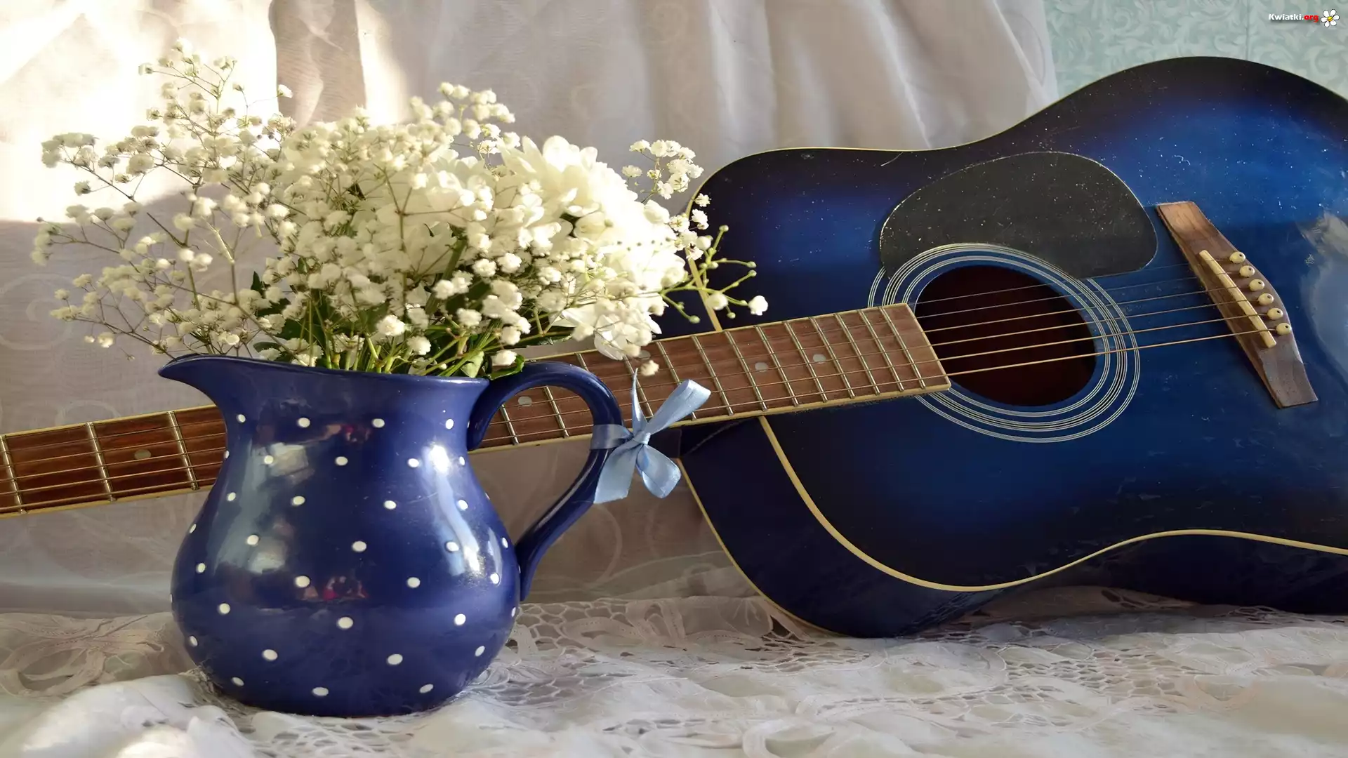 Gitara, Dzbanek, Białe, Kwiaty - Zdjęcia