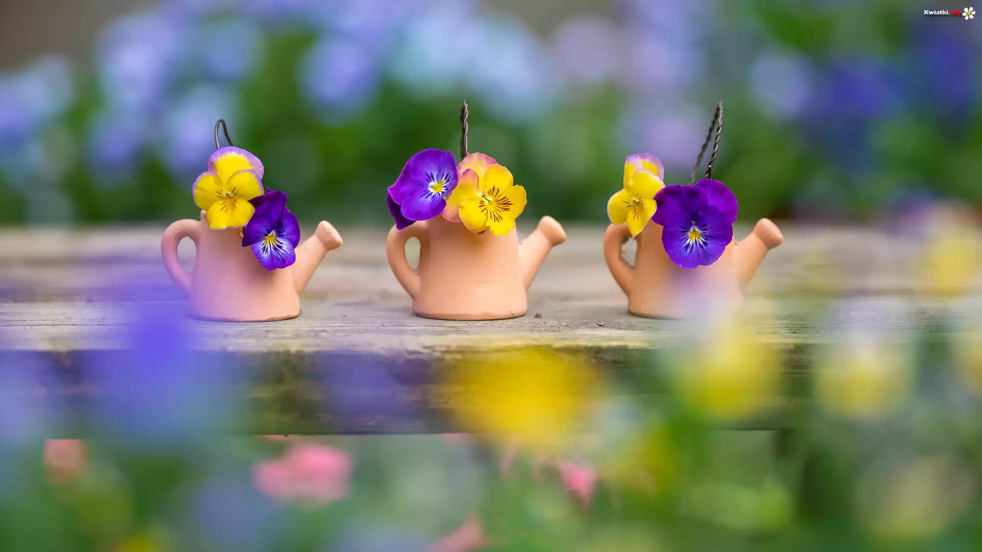 Trzy, Gliniane, Konewki, Kwiaty, Bratki - Zdjęcia